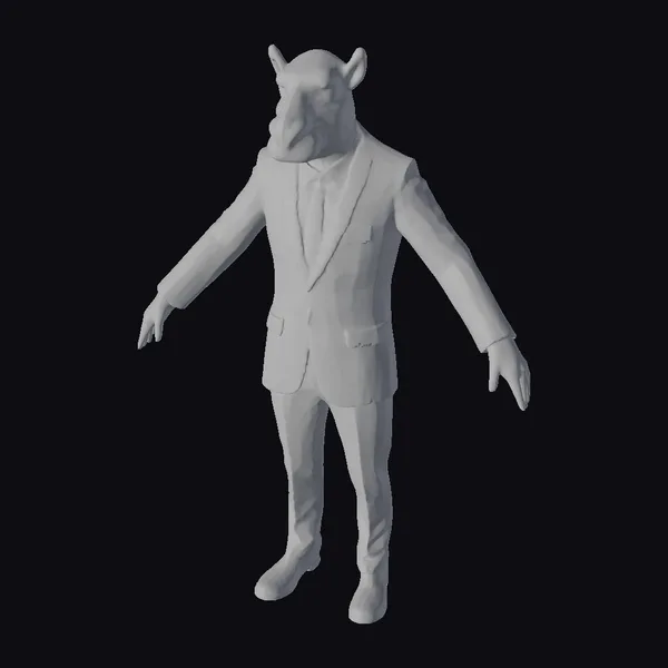 Standing confidently with arms outstretched, this stylized camel boasts a highly detailed head, complete with expressive eyes and a charming smile. Its body is dressed in a sleek black suit, paired with a white shirt and brown tie, exuding a sense of professionalism. The model’s texture and shading are meticulously crafted, bringing out the intricate folds of the suit and the camel’s soft fur. This versatile model is perfect for use in animations, games, or 3D printing projects, offering a unique and eye-catching character that is sure to captivate audiences.
