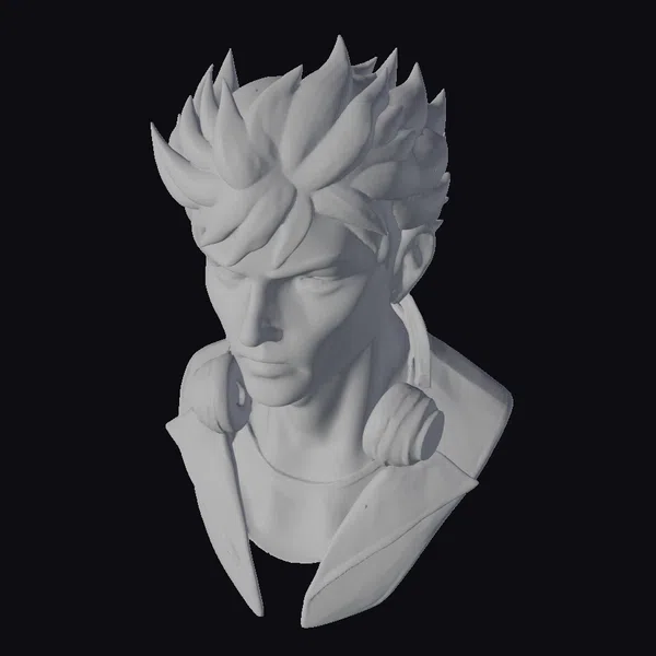 This stylized 3D bust presents a young man with a fierce and intense demeanor. His brown hair is styled in a spiky, attention-grabbing fashion, framing his face which is set in an angry expression. He wears a black shirt under a bold red jacket that adds a pop of color to the overall piece. Black headphones with striking red accents are draped around his neck, suggesting a connection to music or gaming. The model showcases detailed textures and a well-proportioned anatomy, making it suitable for various applications such as animation, game development, or virtual reality experiences. The stylized approach gives the character a unique, cartoonish feel that can appeal to different creative projects.