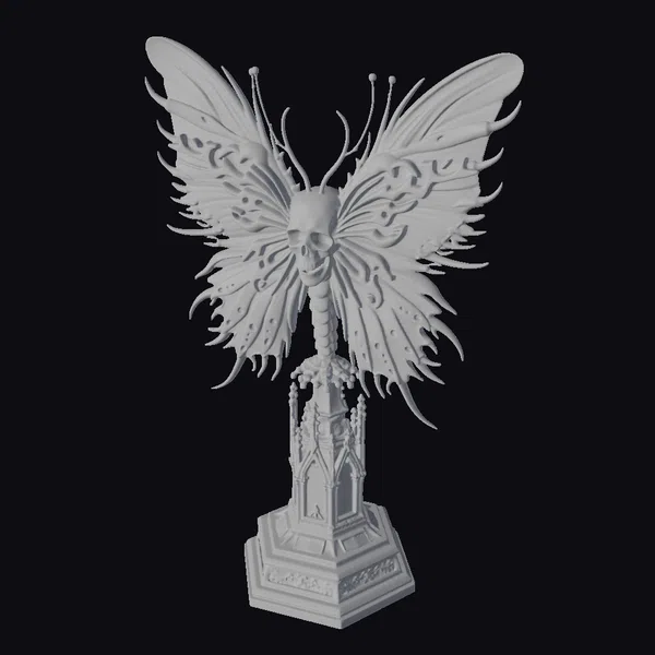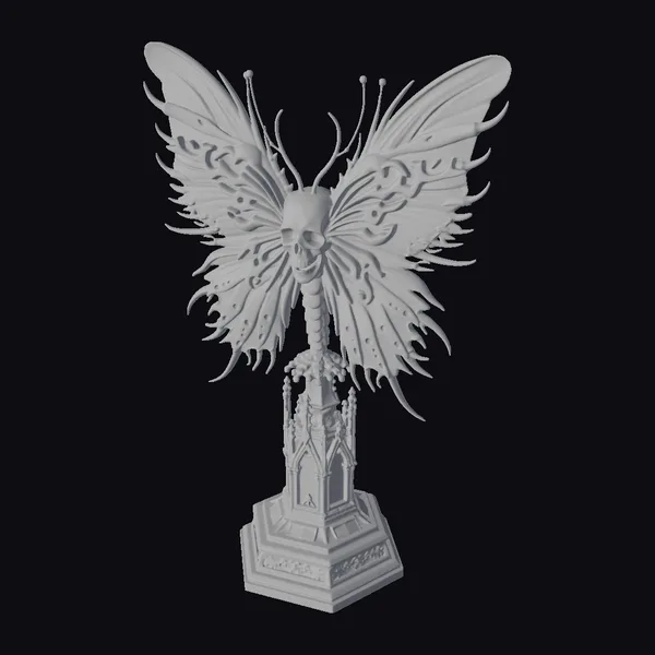 This striking sculpture showcases a butterfly with wings that shimmer in hues of blue and green, gradating to gold and black towards the tips. The wings are adorned with delicate patterns and are mounted on a skeletal head, which seamlessly integrates into the butterfly’s body. The entire piece is elevated on a dark, ornate pedestal, adding to its mystique. The intricate details and metallic sheen suggest a high level of craftsmanship. Ideal for use in games, 3D printing, VR/AR experiences, animation, and design projects, this model is sure to add a unique touch.