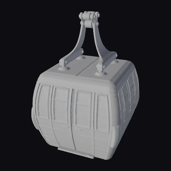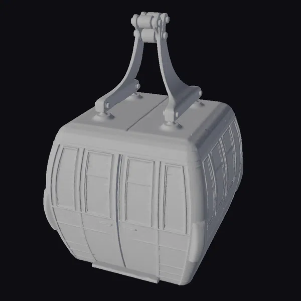 Positioned at a slight angle, the cable car gondola cabin showcases its robust metal frame and expansive windows. The beige and gray hues dominate the exterior, complemented by the dark metal accents of the frame. The model’s texture suggests a weathered appearance, adding character to its industrial design. The interior, visible through the windows, appears dimly lit, inviting speculation about the stories it could tell. This model is perfect for projects requiring a touch of urban or mountainous scenery, suitable for use in games, 3D printing, VR/AR experiences, animations, or architectural designs.