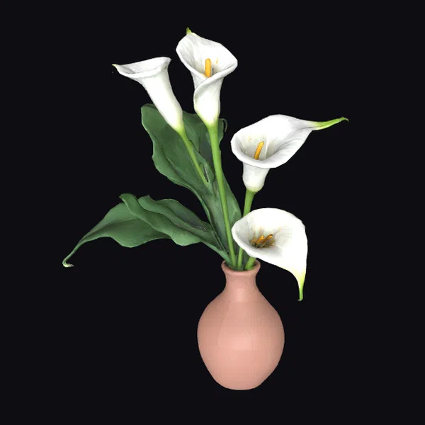 In a majestic pose, a bouquet of five calla lilies emerges from a delicate, peach-colored vase, each flower boasting a smooth, trumpet-shaped white petal with a bright yellow center, surrounded by large, wavy green leaves that add a touch of natural beauty. The realistic textures and lighting bring this floral arrangement to life, making it perfect for use in games, 3D printing, VR/AR experiences, animation, and design projects where a serene and elegant atmosphere is desired.