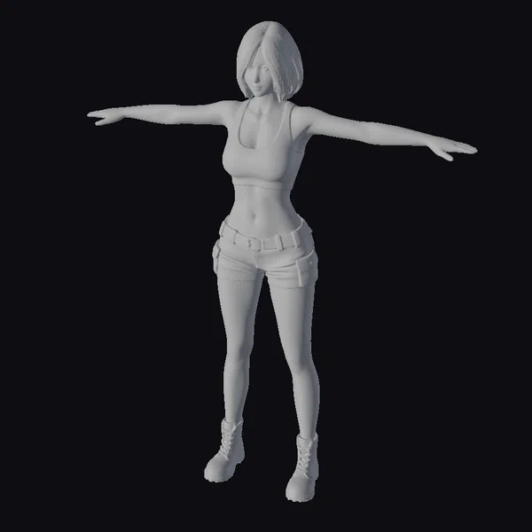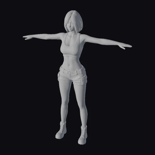 Detailed in every aspect, this 3D model of a female soldier showcases a dynamic pose with arms outstretched, highlighting her athletic build. The camouflage pattern on her sports bra and shorts is intricately textured, blending greens and browns for a realistic effect. Her short, dark hair frames her face, which is set in a determined expression. The model is dressed in a utility belt and combat boots, adding to her military aesthetic. This model is perfect for projects requiring a strong, capable female character, such as animations, games, or virtual reality experiences.