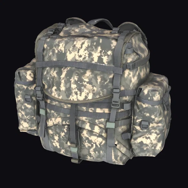 Detailed with precision, this camouflage backpack boasts a sturdy build and a complex arrangement of straps and buckles. The digital camouflage pattern, featuring shades of green, beige, and gray, gives it a modern and tactical look. The backpack’s pose showcases its multiple compartments and pockets, perfect for organizing gear. Its realistic textures and lighting make it suitable for various applications, including games, 3D printing, VR/AR experiences, and animation projects. Designers and artists can use this model to add a touch of realism to their work.