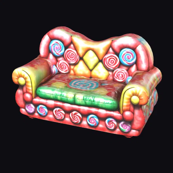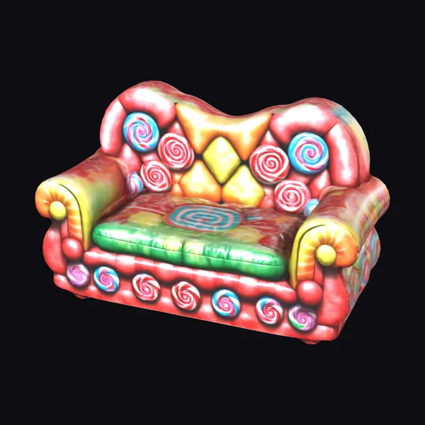 Detailed with precision, this candy couch boasts a sturdy base covered in red candies with swirling patterns, complemented by yellow and green accents. The backrest features a delightful arrangement of lollipops and diamond-shaped candies, while the seat showcases a mesmerizing spiral design. Crafted in a cartoon style, this model is perfect for adding a touch of fantasy to games, animations, or 3D designs. Its colorful and playful vibe makes it an ideal choice for projects requiring a fun and quirky element.