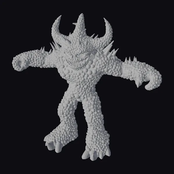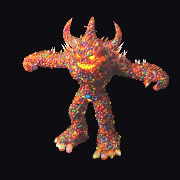 Detailed with precision, the candy golem’s body is a mosaic of small, rounded candies in a vibrant array of colors, including red, orange, yellow, green, blue, and purple. Its eyes glow with a warm, golden light, while its wide, toothy grin suggests a playful yet ominous presence. The golem’s pose is dynamic, with arms outstretched and legs slightly bent, as if ready to spring into action. Its feet end in sharp, claw-like nails that add to its monstrous appearance. This 3D model would be perfect for animations, games, or any project requiring a whimsical yet eerie character. Its unique design makes it an excellent choice for designers looking to add a touch of fantasy and intrigue.