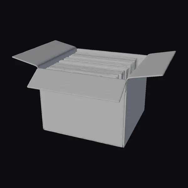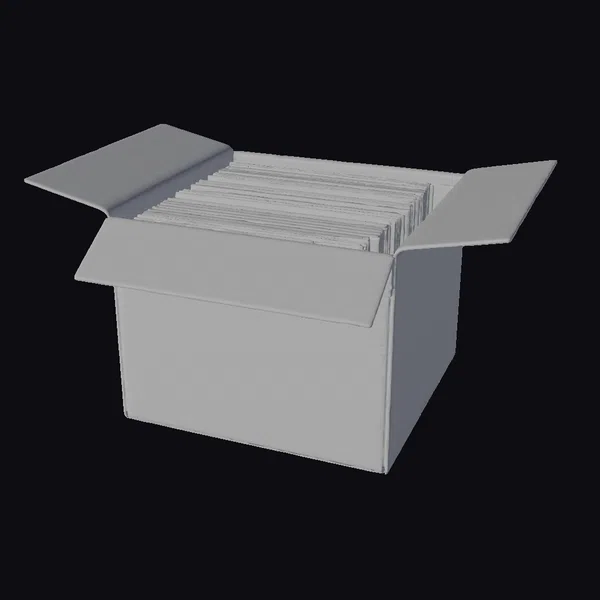 In exquisite detail, the cardboard box sits with its flaps open, showcasing a jumbled stack of vinyl records within. Each record sleeve bears the marks of time – creased, faded, and sometimes torn, they tell a story of extensive play and affection. The box itself, with visible creases and a slightly worn texture, seems to have been a faithful companion in the storage of these musical treasures. The scene captures a moment of nostalgia, perfect for projects requiring a touch of realism and a lot of character. Ideal for use in games, 3D environments, animations, or as a detailed prop in any creative project, this model brings a sense of authenticity and warmth.