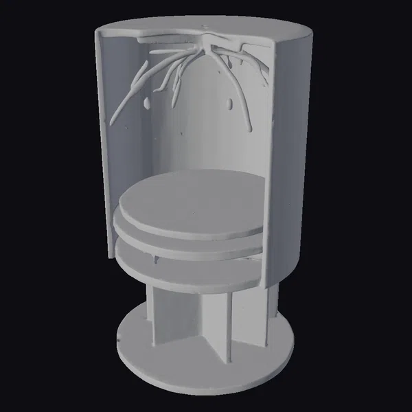 Crafted with meticulous attention to detail, this cardboard carousel stands out with its unique blend of materials and lighting. The cylindrical body, supported by a sturdy wooden base and topped with a matching wooden lid, houses a circular platform that appears to rotate. The interior is illuminated, casting a warm glow through the wooden slats and highlighting the carousel’s playful design. The exterior showcases a mix of cardboard and wooden textures, adding to its charm. Ideal for adding a touch of fantasy to games, animations, or virtual reality experiences, this model is also perfect for designers looking for a distinctive piece to inspire their work.