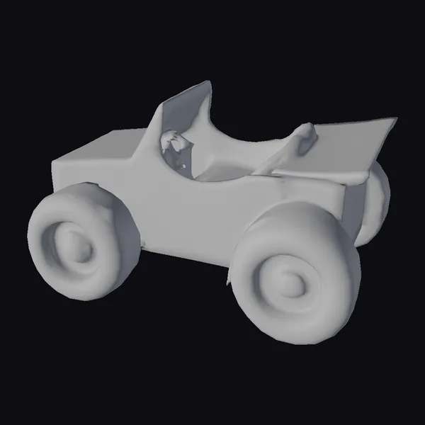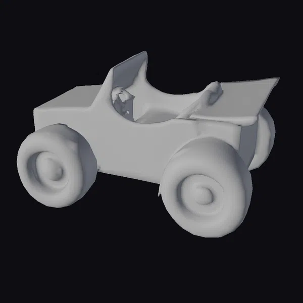 Sitting proudly on its large black wheels with bright red rims, this cardboard toy car is a delightful sight. The vehicle’s body is a bold red, with a simple yet charming smiley face painted on its side. The open top design and tan-colored interior add to its toy-like appeal. The model is detailed enough to capture the corrugated texture of the cardboard, giving it a realistic feel despite its cartoonish style. This model is perfect for use in children’s projects, educational materials, or even as a decorative item. Its playful design makes it suitable for animations, games, or 3D printing.