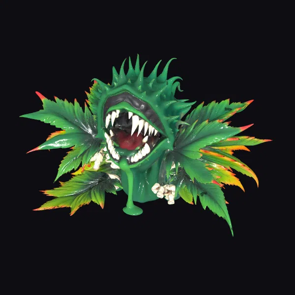 This striking model showcases a hybrid plant creature with a menacing grin, featuring a mass of sharp, white teeth and a red, slobbering tongue. The plant’s body is a tangle of green leaves with orange-tipped edges, giving it a vibrant yet ominous appearance. The creature’s pose suggests dynamic movement, as if it’s about to pounce. Its unique blend of carnivorous and plant-like features makes it a standout piece for any fantasy or sci-fi project. Ideal for use in games, animations, or 3D printing, this model is sure to add a touch of whimsy and danger to your work.