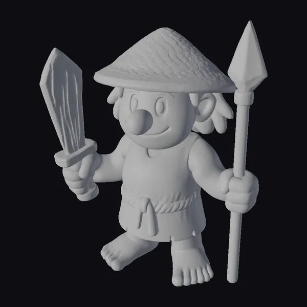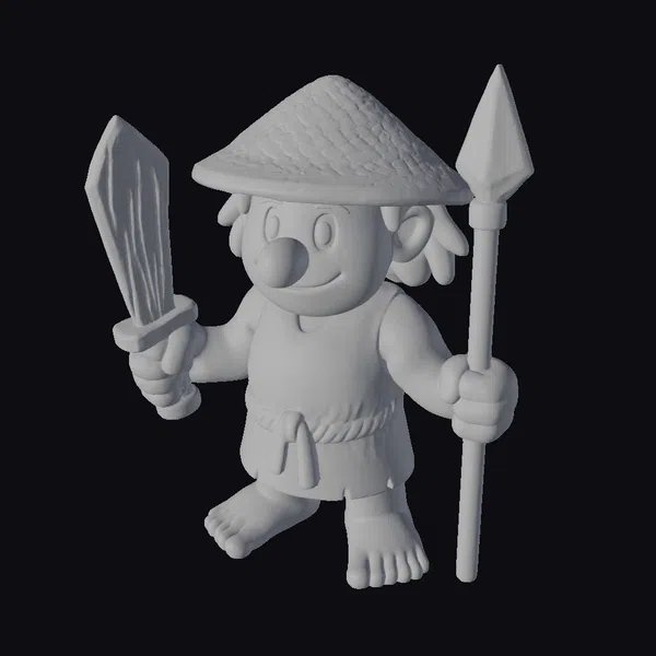 Detailed with a cheerful expression and dynamic pose, this cartoon adventurer model showcases intricate textures and a colorful palette. The character’s attire, including the red top, brown shorts with a yellow belt, and a traditional Asian-style hat, offers a rich visual appeal. Holding a wooden sword and spear, the model is perfect for projects requiring a playful yet heroic character. Ideal for use in gaming, animation, and print projects, this model brings a light-hearted and adventurous spirit to any scene.