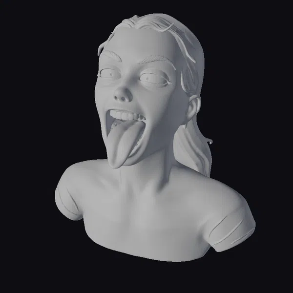 Detailed with precision, this cartoon-style model showcases a woman with a dynamic, angry expression. Her red hair is pulled back, revealing a focused gaze and sharp, orange eyebrows that add to her furious demeanor. The model features a tongue-out pose, emphasizing the intensity of her emotion. The lack of clothing on her upper body allows for versatile application across various projects. Textures are smooth, with clear facial features and skin tones that bring life to the model. Ideal for animations, games, or any project requiring a strong, cartoon character expression.