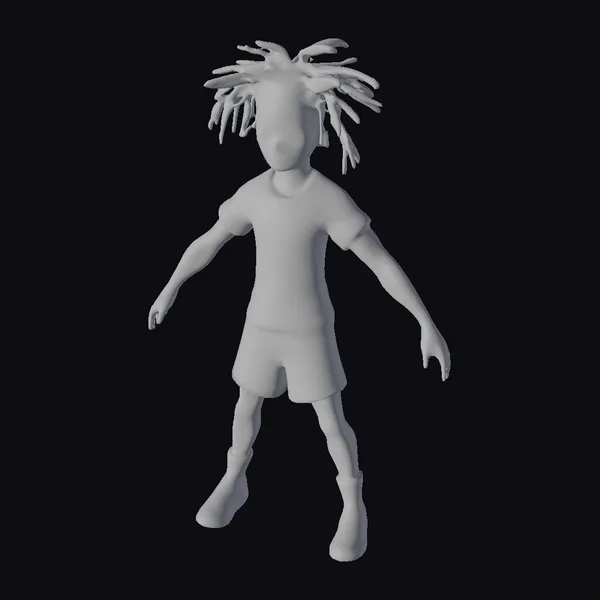 This cartoon boy model showcases a young male character with dark skin and stylish dreadlocks, posed with his arms outstretched to the sides. He wears an eye-catching orange t-shirt, matching shorts, and sneakers, complemented by white socks. The model’s facial features are simplified yet expressive, with large white eyes that add to its cartoonish charm. The overall appearance is playful and fun, making it suitable for various creative projects such as animation, game development, or visual design. The model’s proportions are well-balanced, with detailed textures that enhance its cartoon style. The pose is dynamic yet relaxed, capturing a moment of carefree youth.