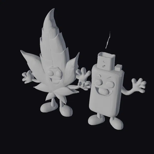 In a dynamic pose that exudes friendliness, a cartoon cannabis leaf with a lively green color and a matching lighter with a warm yellow tone and metallic top, are captured in a moment of joyful interaction. The cannabis leaf boasts detailed textures, from the lighter’s sleek surface to the leaf’s intricate veins. Their facial expressions are warmly inviting, with wide eyes and broad smiles. The lighter even sports a tiny flame rising from its top, adding a touch of realism to its playful design. These characters are versatile assets for projects requiring a lighthearted touch, suitable for animation, games, print materials, VR/AR experiences, and design applications.