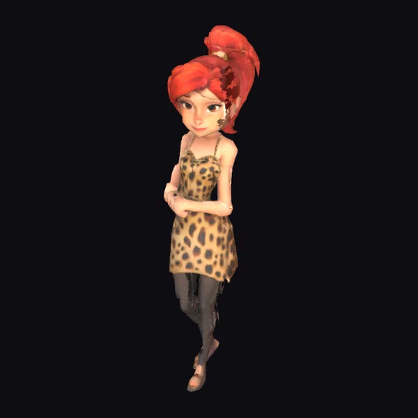 Gazing at this model, your eyes are drawn to the intricate details of her cartoon-style features, from the gentle smile to the poised stance. Her red hair is styled in a chic, high ponytail, complementing her expressive facial features. The leopard-print dress, paired with black leggings and sandals, showcases a unique blend of stone-age simplicity and modern flair. The pose, with arms crossed and one leg playfully lifted, captures a moment of carefree confidence. This model is perfect for projects requiring a blend of fantasy and historical elements, suitable for animation, game development, or as a decorative piece.