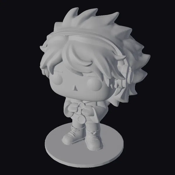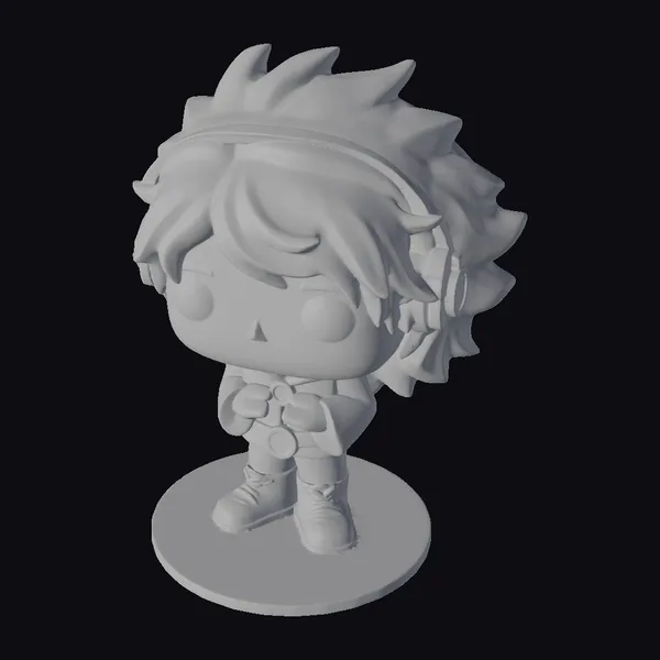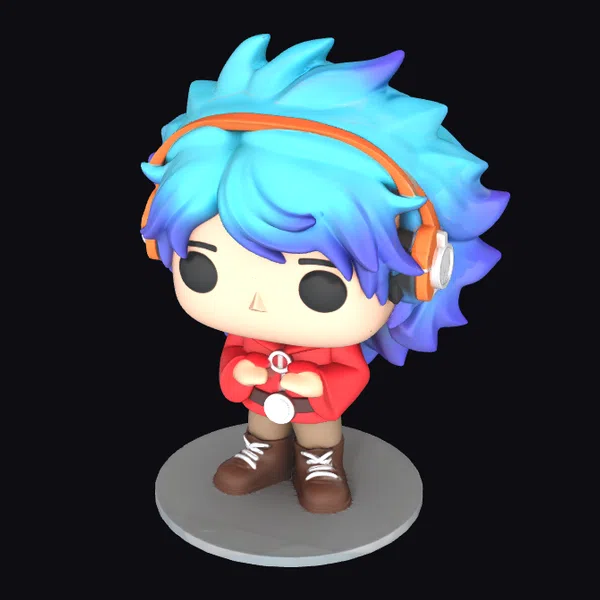 Standing proudly on a gray base, this cartoon character figurine showcases intricate details such as spiky blue hair, a red shirt with a white logo, brown shoes with white laces, and orange headphones with a white accent. The character’s hands are clasped together in front, adding to the overall sense of playfulness. This figurine is perfect for gamers, anime fans, and anyone who loves colorful characters. Its high-quality design makes it suitable for display, 3D printing, or use in animations and games.