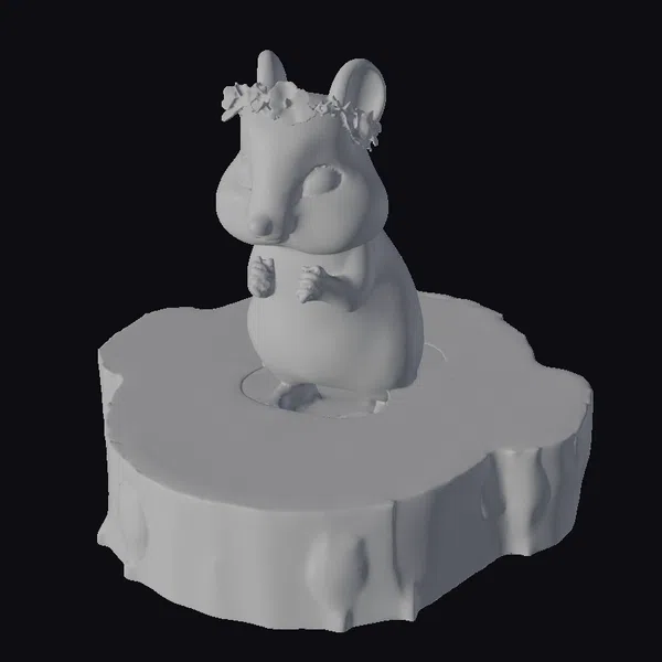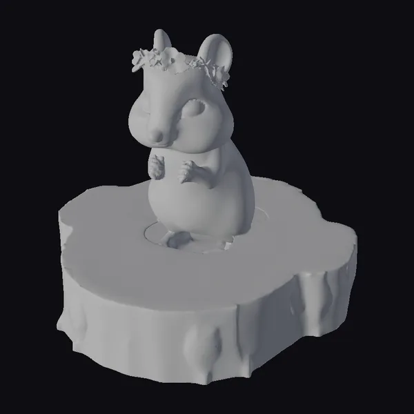 In a pose that captures both playfulness and serenity, this chibi chipmunk stands on a meticulously detailed round slice of wood, complete with visible rings and bark texture. The chipmunk itself boasts a soft, cartoonish aesthetic with exaggerated features such as oversized eyes and a diminutive nose. A delicate garland of pink flowers encircles its head, adding a touch of elegance. This model is perfect for projects requiring a blend of cuteness and detailed texturing, suitable for animations, games, or as a decorative element in 3D environments. The model’s intricate details, from the chipmunk’s fur texture to the wooden base’s grain, ensure a high-quality visual experience.