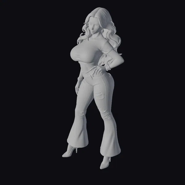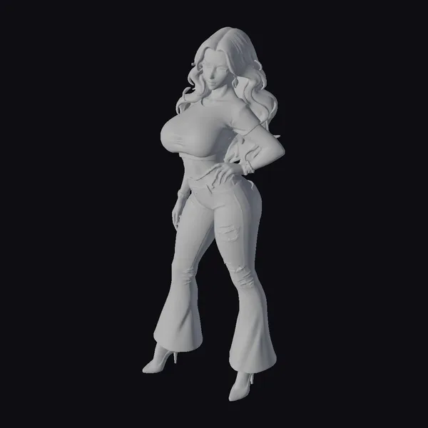 Detailed with precision, this cartoon curvy woman model showcases a vibrant and lively character. She stands with a confident posture, one hand resting on her hip, highlighting her curvy figure clad in ripped blue jeans and a white cropped top. Her long, wavy brown hair flows down her back, complementing her bright blue eyes and bold makeup. Black high heels add a touch of elegance to her overall casual yet stylish outfit. The model’s detailed textures, from the ripped knees of her jeans to the shine of her heels and the flow of her hair, make her a versatile asset. Ideal for use in animations, games, VR/AR experiences, and various design projects where a confident, fashionable female character is needed.