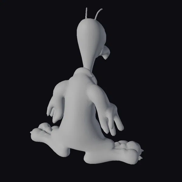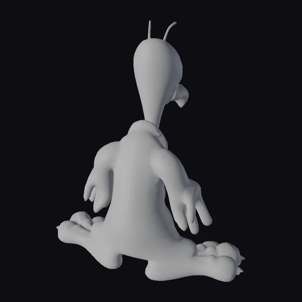 Detailed with a bulbous, smooth head, two thin antennae-like protrusions on top, and a large yellow beak pointing downwards, this cartoon duck model exudes a playful vibe. Its shiny black body is complemented by oversized yellow feet, each featuring three claw-like nails. The model showcases a high level of detail, from the texture of its smooth head to the joints of its slightly outstretched arms. The duck’s pose, sitting on its haunches with arms slightly extended, suggests it’s ready for action or perhaps deep in thought. Ideal for animations, games, or any project requiring a quirky character, this model is sure to bring a smile.