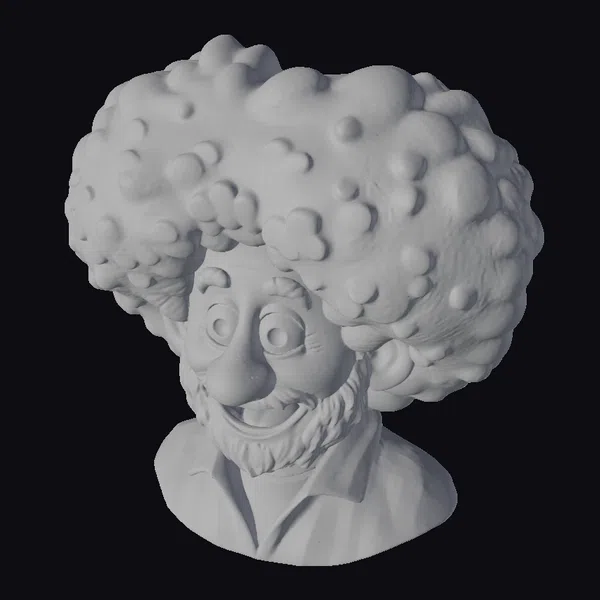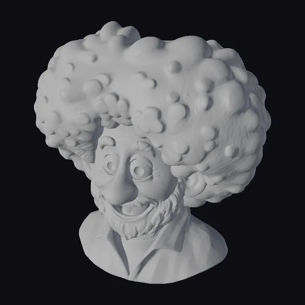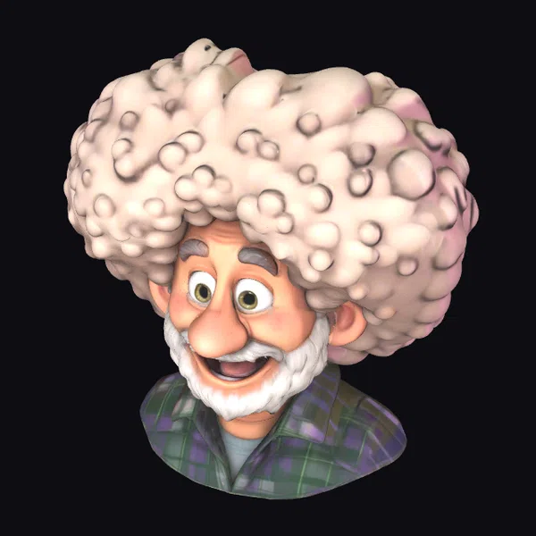 Positioned in a slight turn, this character’s head and shoulders are presented in a cheerful, cartoon-like manner. The model showcases a highly textured, curly hairstyle that commands attention, complemented by a neatly trimmed white beard and mustache. His eyes are wide with a hint of surprise, and he sports a green, purple, and blue plaid shirt over a light blue undershirt. The detailed textures, from the bumpy curls to the plaid pattern, are meticulously rendered. This model is perfect for projects requiring a friendly, elderly character, such as animations, games, or virtual reality experiences.