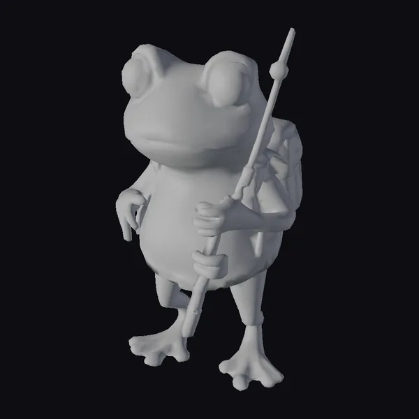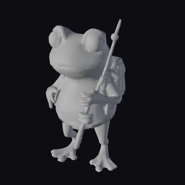 This delightful cartoon frog model is posed walking on its hind legs, giving it a surprisingly human-like stance. The frog’s vibrant green skin transitions to yellow on its belly and orange on its feet, adding a pop of color. Its large, round eyes are full of curiosity, and its small backpack and fishing pole suggest it’s on a mission to explore and catch some fish. The model is rich in detail, from the texture of its skin to the straps of its backpack. It’s perfect for projects that require a whimsical touch, such as animations, games, or children’s book illustrations.
