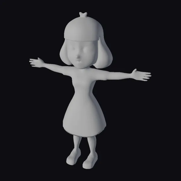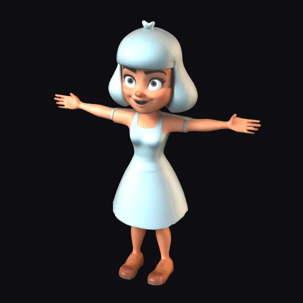 Detailed visually, she boasts a radiant complexion with a subtle sheen on her light blue dress and hat, which features a small tuft on top. Her facial features are accentuated by wide eyes and a cheerful smile. The 3D model showcases her in a dynamic A-pose, with arms stretched out to the sides. Her brown shoes are finely detailed, complementing her short, bobbed hair. This model is perfect for projects requiring a nostalgic 1960s cartoon aesthetic, suitable for animation, games, print media, VR/AR experiences, and design applications.