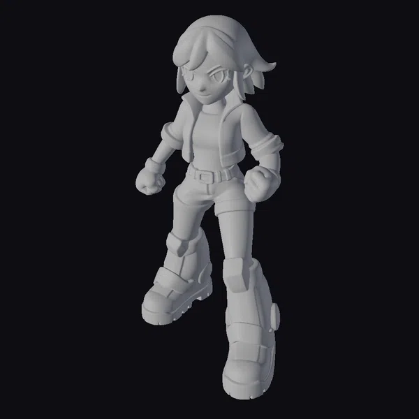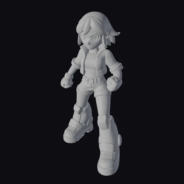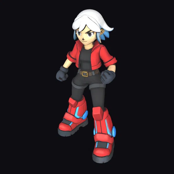 Detailed with precision, this cartoon-style character model showcases a young woman with a dynamic stance, highlighted by her red jacket and boots. Her white hair is styled with blue accents, adding a pop of color. The model’s black pants and gloves provide a sleek contrast. Her facial features are defined with care, capturing a determined expression. Ideal for projects requiring a lively, animated character, such as animations, games, or virtual environments.