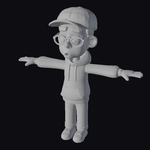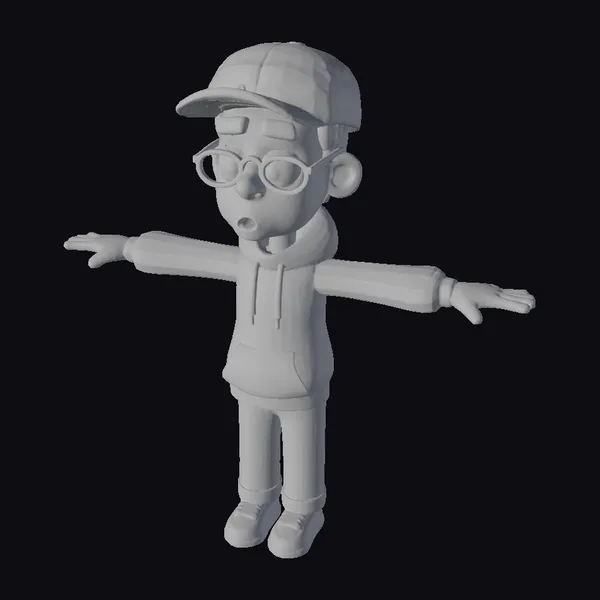 This stylized cartoon character, a young boy with a curious expression, is posed with arms outstretched and a look of wonder on his face. He wears a blue baseball cap with a white logo, red glasses, a blue hoodie with red drawstrings and a white fur-lined collar, blue pants, and black shoes. The model’s proportions are exaggerated, with large eyes and a small nose, giving it a playful and adventurous feel. The textures are smooth and vibrant, with a focus on bright colors like blue, red, and white. This model is ideal for use in animations, games, or 3D printing projects that require a youthful and inquisitive character. Its stylized design allows for flexibility in various creative applications.