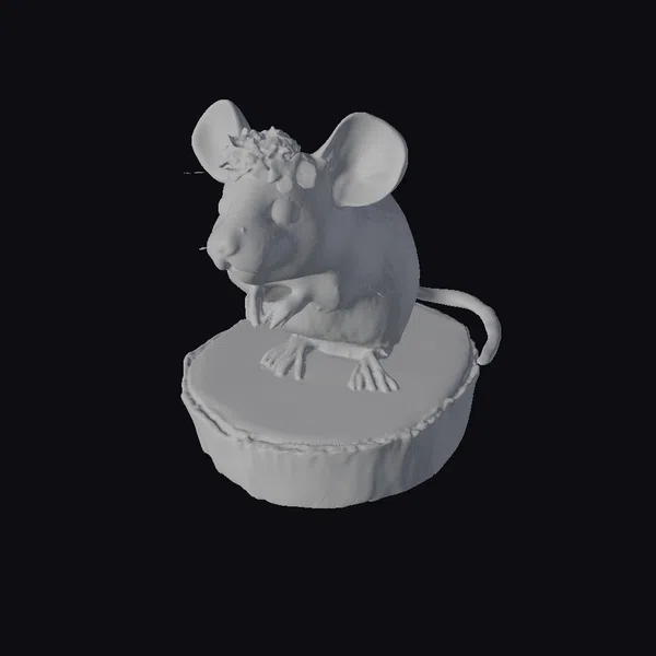 In a pose that captures both curiosity and caution, the cartoon mouse stands on its hind legs, front paws clasped together in a gesture of innocence. The crown of flowers, a colorful medley of purples, whites, and yellows, adds a touch of festive charm to the mouse’s already considerable appeal. The wooden base, with its rough-hewn texture and natural edge, provides a sturdy foundation for this diminutive figure. As a 3D model, this delightful creature is poised to bring a touch of magic to a variety of creative projects, from animated films and video games to decorative designs and conceptual art. Its small size and intricate details make it an ideal candidate for close-up shots or integration into larger scenes.