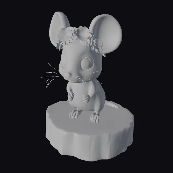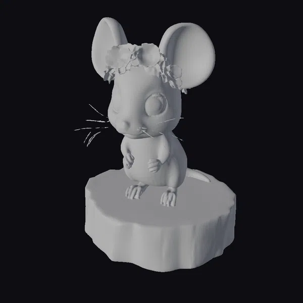 This charming cartoon mouse stands proudly on a round slice of natural wood, its base textured to resemble tree bark. The mouse itself boasts a soft gray coat, large pink ears, and a delicate pink nose and paws. Its oversized, shiny black eyes sparkle with innocence. A beautiful floral crown, composed of yellow, pink, purple, and white flowers, adorns its head, adding a touch of elegance. The model’s intricate details, from the texture of its fur to the delicate petals on its crown, make it perfect for use in games, animations, or as a decorative piece. Its whimsical nature also lends itself well to print, VR/AR experiences, and design projects.