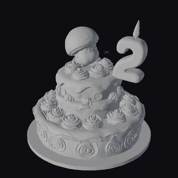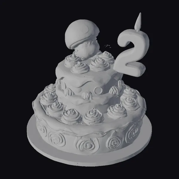 Gaze upon a majestic, multi-tiered birthday cake, its layers stacked high with colorful frosting and adorned with an assortment of decorative cupcakes. Atop this sweet creation, a large cartoon mushroom cake topper takes center stage, complete with a cheerful face and bright red cap. A large, lit number two candle adds a warm glow to the scene. The cake’s frosting is meticulously detailed, with swirling patterns and decorations that showcase a playful, artistic style. The entire scene exudes a festive atmosphere, perfect for celebrations and special occasions. Use this delightful 3D model in games, animations, or designs where a touch of whimsy is needed.
