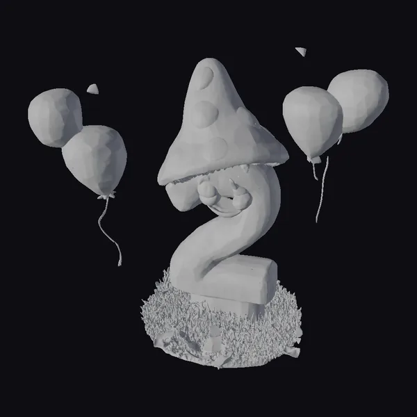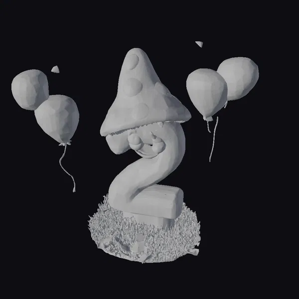 Deep in a fantastical forest, a delightful cartoon mushroom takes center stage, shaped like the number two and sporting a vibrant red cap adorned with white spots. The mushroom’s yellow body curves elegantly, forming the number two, and is topped with a cheerful face featuring black eyelashes and a red mouth. It sits on a bed of lush green grass dotted with tiny flowers and surrounded by a cluster of colorful balloons in shades of pink, yellow, and red. The scene exudes a festive atmosphere, perfect for birthday celebrations. This charming model is ideal for use in games, 3D printing, VR/AR experiences, animation, and design projects, bringing a touch of whimsy and joy to any creative endeavor.