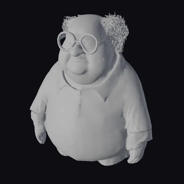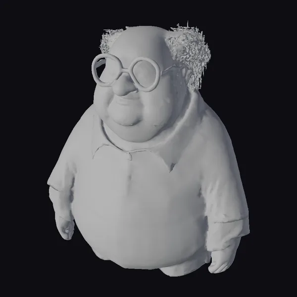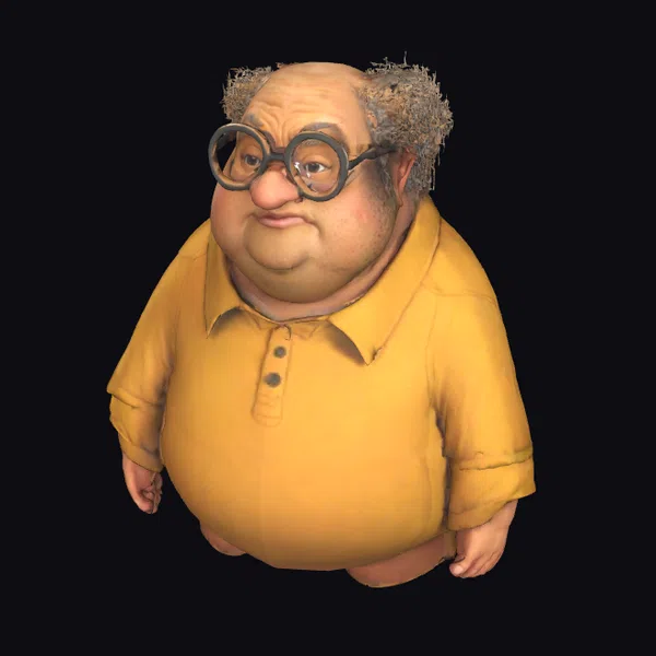 Get up close and personal with this delightful cartoon character, showcasing a rotund figure with a warm smile. His curly gray hair and thick, black-rimmed glasses add to his charm. The character’s bright yellow, collared shirt with three buttons is meticulously detailed, with wrinkles and folds that enhance his realistic yet stylized appearance. The pose, with arms relaxed by his sides, invites a sense of approachability. Ideal for animations, games, or designs where a friendly, relatable character is needed, this model is sure to bring a smile.