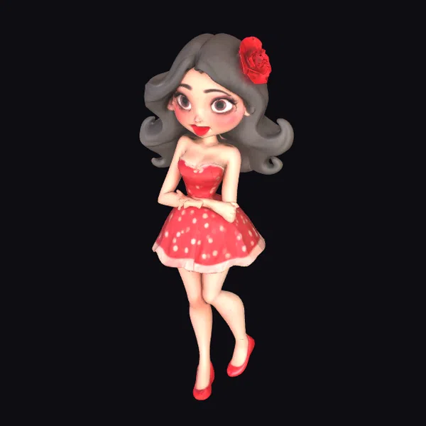 In a pose that exudes confidence and playfulness, this cartoon pinup girl showcases a meticulously designed appearance. Her long, dark hair flows around her, highlighted by a bold red rose tucked elegantly to one side. Her bright smile and detailed makeup accentuate her pretty face, while her red dress with white polka dots and matching shoes add a touch of classic charm. The model boasts a high level of detail, from the texture of her dress to the expression on her face, making her suitable for a variety of creative projects, including games, animation, and print materials. Her cartoonish style ensures she can be used in both modern and vintage-themed settings, offering versatility for designers.
