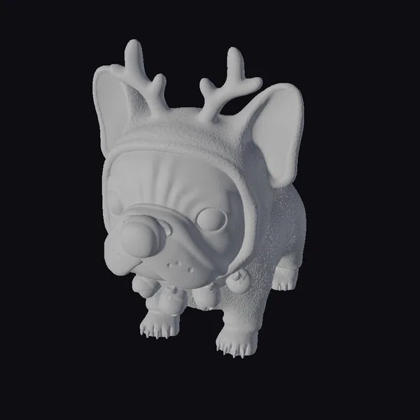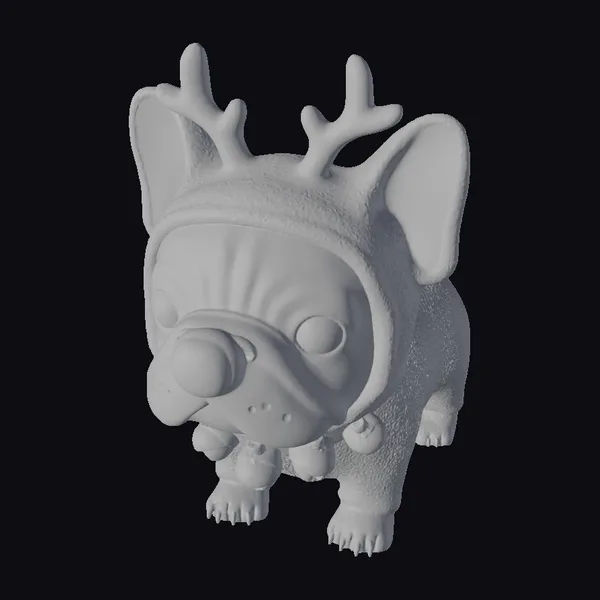 This endearing cartoon French bulldog is dressed in a detailed reindeer costume, complete with a soft, fuzzy hood adorned with brown antlers and a shiny red nose. The dog’s large, expressive brown eyes are full of warmth and friendliness. A green and red collar with golden bells adds a touch of festive elegance. The model showcases a charming, stylized design, making it perfect for holiday-themed projects, animations, or games. Its cute appearance and joyful demeanor are sure to capture hearts.