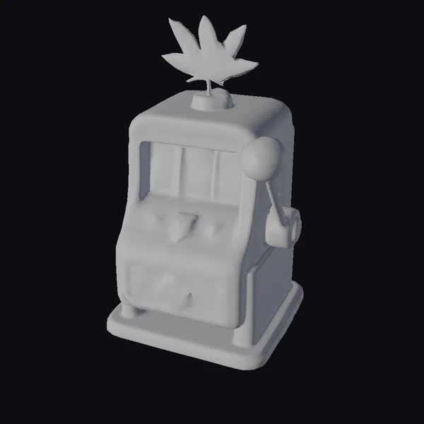 In a dynamic pose, this cartoon slot machine showcases intricate details such as three spinning reels with gold symbols, a gold lever with a red ball on top, and a base adorned with more cannabis leaves. The textures are rich and playful, with a clear emphasis on visual appeal. The machine’s peach and green body gleams with a shiny finish, while the gold accents add a touch of luxury. The cannabis leaf on top and on the front panel’s gold design element hint at a unique theme. Ideal for use in games, animations, or as a decorative piece, this model brings a burst of fun and color to any project. Its cartoon style ensures it stands out without being too realistic, making it perfect for projects needing a light-hearted touch.