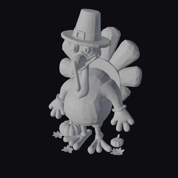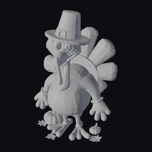 Step into a whimsical world of thanksgiving cheer with this endearing cartoon turkey. The model boasts a richly detailed appearance, from the soft, brown plumage of its body to the striking orange-red hues of its fanned tail feathers. A classic black pilgrim hat, adorned with a shiny gold buckle, adds a touch of historical charm. The turkey’s expressive face, complete with bright, inquisitive eyes and a jaunty red wattle, invites engagement. Paired with crisp white gloves, a vibrant yellow beak, and sturdy orange legs, this character exudes a playful yet dignified demeanor. The inclusion of two small pumpkins and scattered autumn leaves at its feet enhances the seasonal ambiance. Ideal for animations, games, or VR/AR experiences, this model brings a festive spirit to any project. Designers and artists can leverage its detailed textures, dynamic pose, and inviting mood to craft compelling narratives or simply add a dash of whimsy to their work.