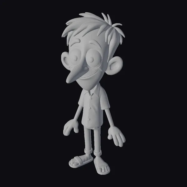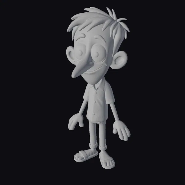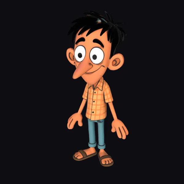 Rendered in a vibrant cartoon style, this young boy character stands with a friendly smile, his arms relaxed by his sides. His black hair is styled in a spiky fashion, complementing his large, expressive eyes and long nose. He wears an orange plaid shirt with rolled-up blue jeans and brown sandals, exuding a casual and approachable vibe. The detailed textures and pose make him an excellent addition to animations, games, or any creative project requiring a youthful character. His adaptable nature allows him to fit seamlessly into various scenarios, from educational content to entertainment.