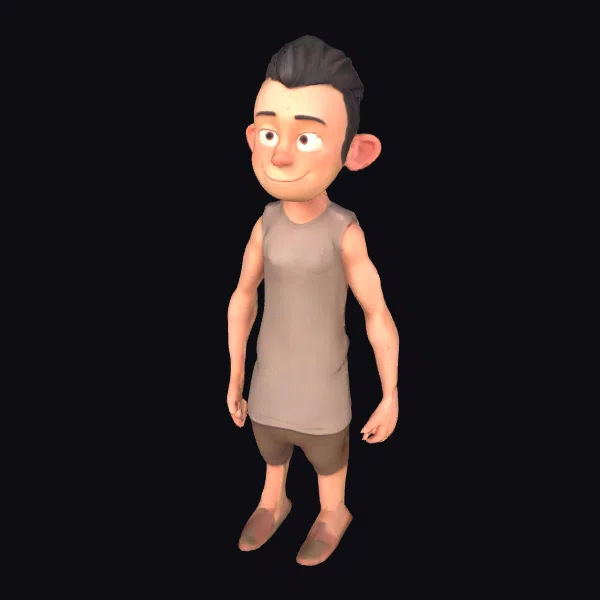 Detailed with a vibrant, digitally painted texture, this 3D model of a cartoonish male hero captures a dynamic pose with arms outstretched straight, embodying a sense of readiness and resilience. The character’s design, reminiscent of Pixar’s stylized animations, features a brown sleeveless shirt and shorts, complemented by rosy cheeks and expressive eyes that convey a friendly demeanor. The model is highly versatile, suitable for various applications such as game development, animated films, virtual reality experiences, and architectural visualizations. Its game-ready status ensures seamless integration into multiple projects.