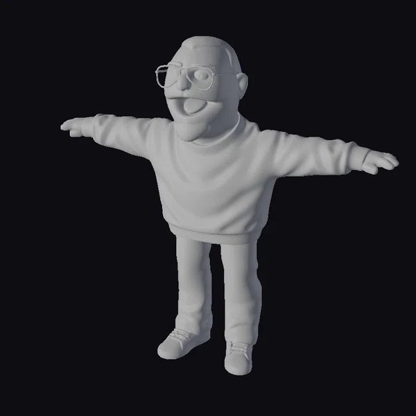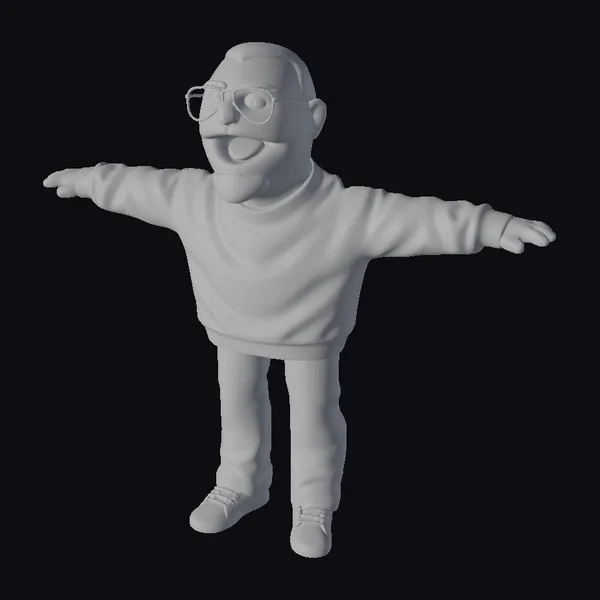 Standing with arms outstretched and a wide grin on his face, this cartoonish male puppet model is a delightful addition to any animation, game, or design project. His short brown hair and distinctive goatee add to his charm, while his black and white sweatshirt with white stripes on the sleeves, paired with blue jeans and white sneakers, give him a stylish and casual appearance. The model’s proportions are well-balanced, with detailed textures that enhance his comedic expression. The puppet’s pose suggests movement and energy, making it ideal for scenes that require dynamic character interactions. Whether you’re working on an animated series, a video game, or a VR experience, this character model is sure to bring a smile to your audience’s faces.
