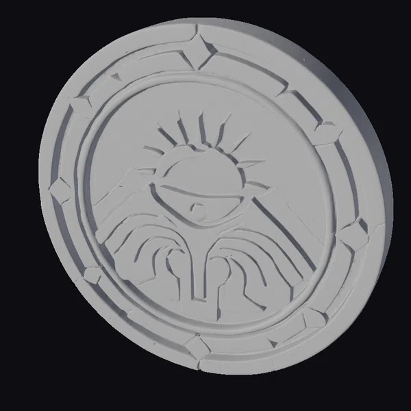 In a majestic pose, the carved sun symbol commands attention with its intricate details and textures. The sun itself is a masterpiece of design, with rays extending outward in a dynamic, fiery display. A glowing blue eye at the sun’s base adds an air of mystique, while the stone texture provides a sense of age and wisdom. The emblem’s ornate border, adorned with geometric patterns, frames the scene with a sense of reverence. As a 3D model, this symbol is perfect for use in games, animations, or architectural designs where a touch of fantasy and mysticism is desired. Its high level of detail and realistic textures make it an excellent choice for projects requiring a sense of authenticity.