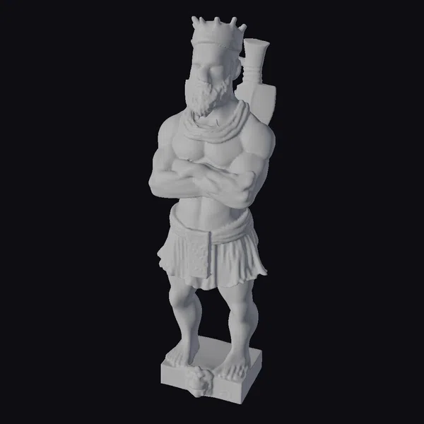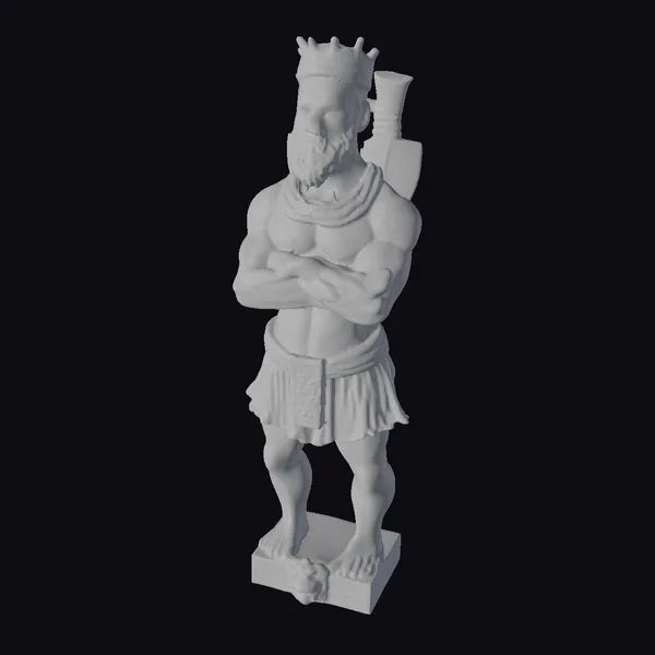 This highly detailed 3D model of a carved wooden statue of a muscular African Yoruba warrior holding an axe showcases exceptional craftsmanship. The statue stands on a square base, with a lion’s head carved into the front, adding a touch of ferocity and power. The warrior’s facial features are meticulously carved, with a strong jawline and a focused expression. The wooden texture is finely rendered, with visible grain and a warm, earthy tone. The model is perfect for use in games, 3D printing, VR/AR experiences, animation, and design projects. Its realistic style and intricate details make it an excellent choice for projects requiring a high level of authenticity.