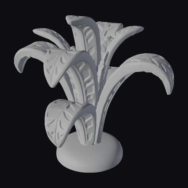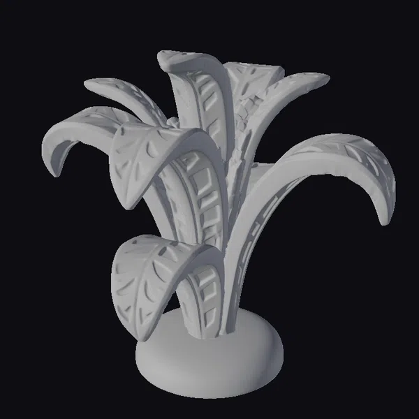Perched atop a smooth, rounded base, the plant’s trunk rises with a subtle texture, supporting a lush canopy of curved leaves. Each leaf showcases a beautiful contrast of darker, richly detailed patterns against the lighter wood, creating a sense of depth and realism. The model is perfect for adding a touch of organic elegance to games, animations, or 3D environments. Its stylized yet realistic appearance makes it suitable for various applications, from interior design visualizations to VR/AR experiences.