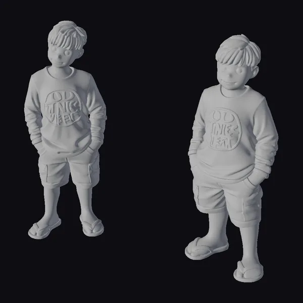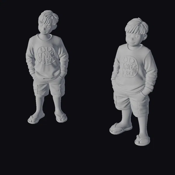 Detailed with precision, this cartoon-style young boy features a charming smile and stylish brown hair. He wears a grey sweatshirt with vibrant orange text, beige shorts, and blue flip-flops. His hands are casually tucked into his pockets, exuding a carefree vibe. Ideal for animations, games, or design projects, this model brings a youthful energy to any setting. The high-quality details make him suitable for close-up shots or scenes requiring a lively character.