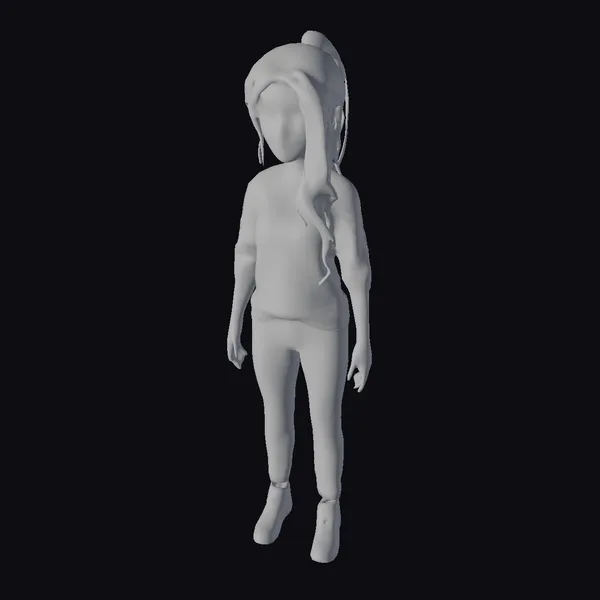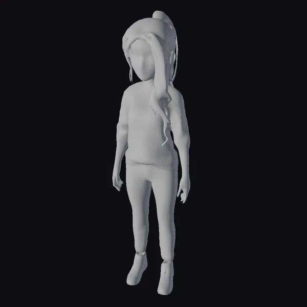 Floating in a serene state of daydreaming, this stylized character model showcases a young girl with a contemplative expression, her gaze slightly downcast as if lost in her own thoughts. Her long, brown hair is elegantly tied up in a high ponytail, cascading down her back in soft waves. She wears a crisp white shirt with rolled-up sleeves, fitted blue jeans that are slightly faded, and comfortable-looking white sneakers. The model’s pose is relaxed, with her arms hanging loosely by her sides, capturing a moment of quiet introspection. The stylized, cartoonish appearance makes her versatile for various creative projects, from animated films and video games to virtual reality experiences and design visualizations. Her detailed textures, balanced proportions, and vivid colors bring a lively yet soothing presence to any scene.
