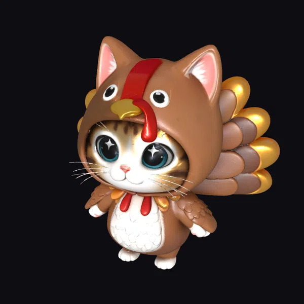 Detailed in every aspect, this 3D model of a cat in a turkey costume showcases intricate textures and a lively pose. The cat’s large, expressive eyes sparkle with curiosity, while the turkey costume is adorned with shiny gold feathers and a distinctive red snood. The model’s proportions are well-balanced, with a clear emphasis on the cat’s cute features and the turkey’s vibrant plumage. The stylized approach gives the model a cartoonish feel, making it ideal for use in animation, games, or as a decorative element in design projects. Its playful and humorous nature can add a unique charm to various applications, from children’s content to creative design projects.