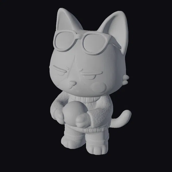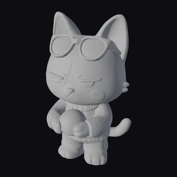 Detailed with precision, this cartoon cat boasts a sturdy build and smooth textures, donning black sunglasses perched atop its head, a teal sweater that adds a casual vibe, and a pink ball it’s tenderly holding. The cat’s gray fur, contrasted with white paws and face markings, creates a visually appealing combination. Its pink accents on the ears, nose, and cheeks bring a touch of whimsy. This model shines in various applications, from animation and game development to 3D printing and virtual reality experiences, offering a versatile asset for creators. Its cute and playful demeanor makes it perfect for projects requiring a friendly, approachable character.