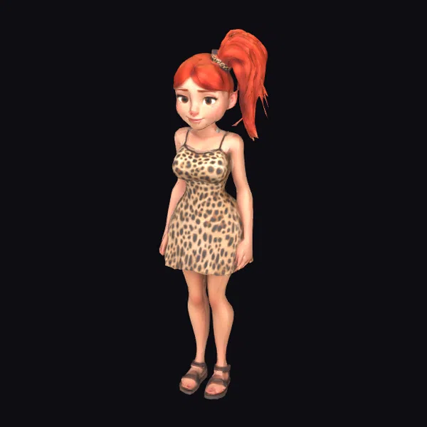 Detailed with great care, this cartoonish cave girl stands out with her fantastic proportions and ultra-realistic features, despite her stylized appearance reminiscent of Pixar. Her dress, adorned with leopard spots, and her brown sandals, add to her prehistoric charm. The model showcases a youthful woman with a gentle smile, her red hair pulled back, revealing a face that exudes innocence and curiosity. She is perfectly suited for projects that require a blend of fantasy and historical elements, such as animations, games, or designs aiming for a playful, adventurous vibe.