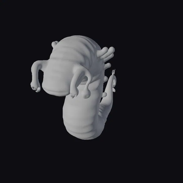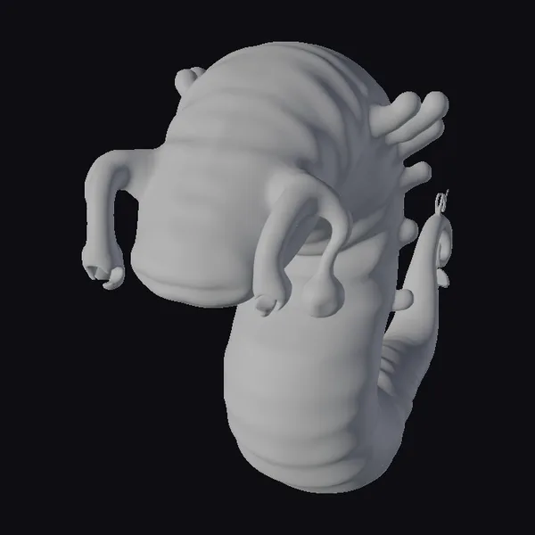 Floating dynamically in mid-air, this creature showcases its bulbous, pale body adorned with smooth, slimy textures that catch the light. Its limbs are curled and twisted in a playful, cartoonish pose, as if caught in a moment of whimsical dance. The creature’s large, rounded head features a small mouth and nostrils, giving it a dreamy, ethereal appearance. Its overall shape and form evoke a sense of oddity and fantasy, making it a perfect addition to any project that requires a touch of the extraordinary. Whether you’re working on a game, animation, or design project, this creature is sure to inspire wonder and curiosity. Its unique features and textures make it an excellent choice for those looking to add a touch of magic to their work.
