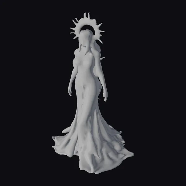 This stunning goddess figure is meticulously crafted with an iridescent skin that shifts between cosmic hues of purple, blue, and gold, giving her an otherworldly appearance. Her long, flowing dress not only trails behind her but also appears to be dynamically moving, as if caught in a moment of gentle motion. The dress is adorned with subtle starlight accents, enhancing its celestial theme. A golden, sunburst-like crown adorns her head, complete with detailed textures that suggest a metallic sheen. The goddess’s pose is confident and serene, embodying both power and grace. Her facial features are finely detailed, with a calm and serene expression. This model is perfect for projects requiring a mythical or divine character, suitable for use in games, 3D printing, VR/AR experiences, animation, and design projects.