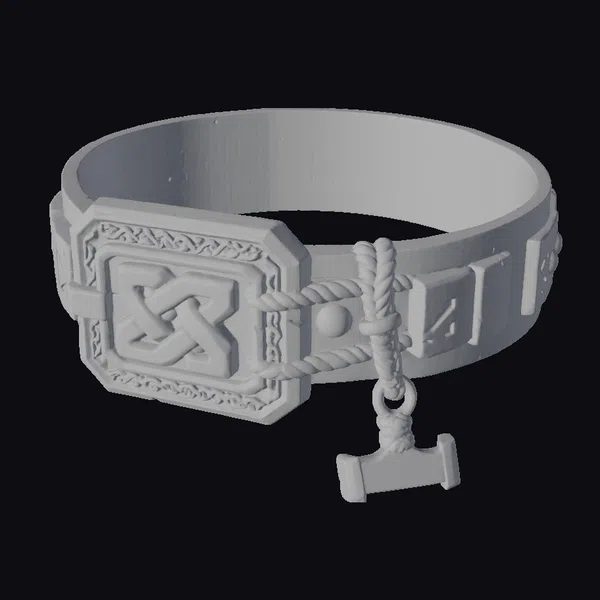 Crafted with meticulous attention to detail, the collar’s brown leather strap features a beautifully textured surface, complemented by a large gold buckle adorned with Celtic knotwork. A series of smaller metal plates, each bearing unique Celtic-inspired designs, add an extra layer of visual interest. A delicate, braided leather cord secures a small, gold hammer charm, completing the piece. This stunning collar is perfect for those who appreciate fantasy and mythology, and can be used in various creative projects, such as game development, animation, or 3D printing.